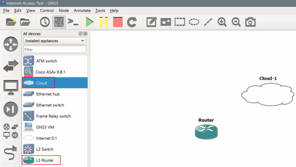 - Within the topology, ensure you have at least one router and one “cloud” device. Specifically, make sure this is “Cloud” and not “Internet 0.1”, as follows: