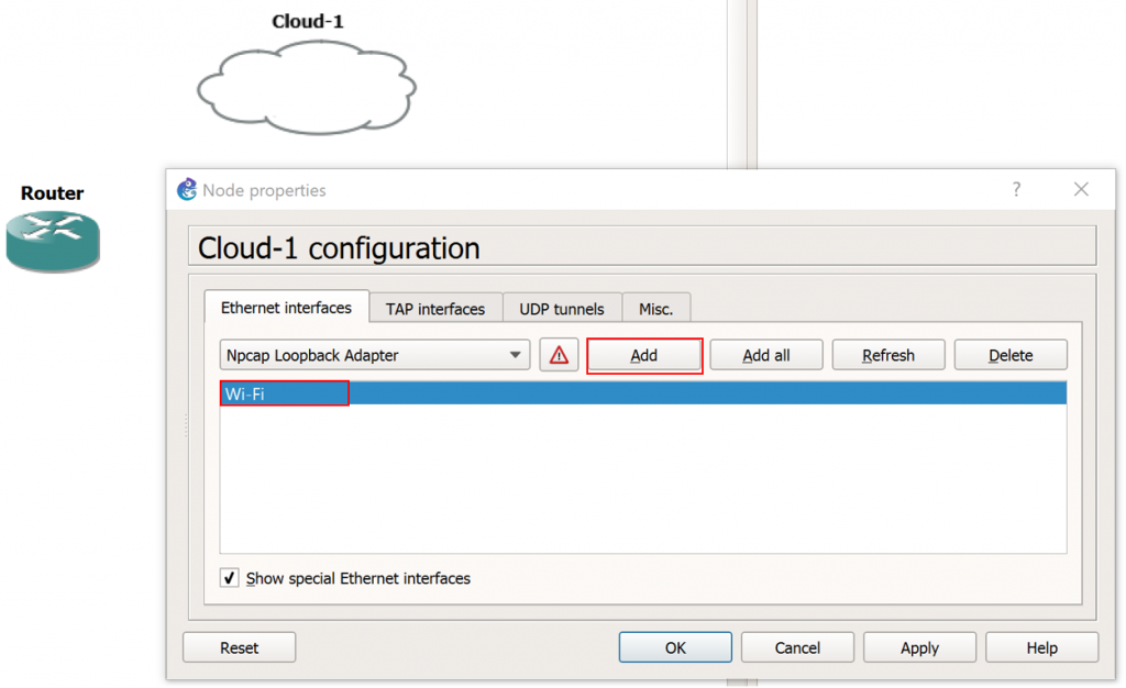 5. This next step will depend upon which physical network interface on your GNS3 workstation is connected to the Internet. In my case, my Internet facing NIC is labeled “Wi-Fi” within Windows. Select the drop down menu and select the appropriate NIC for your workstation which provides internet connectivity, and click Add, as follows: