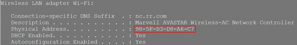 7. Before we make the required configuration changes on the router to get this working, there’s one piece of information we’ll need: The MAC address of your internet facing NIC card. Open a command prompt, and type ipconfig / all. Locate the internet facing NIC in the commands output, and copy its MAC address, as follows: