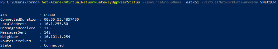 Get-AzureRmVirtualNetworkGatewayBgpPeerStatus -ResourceGroupName TestRG1 -VirtualNetworkGatewayName VNet1GW
