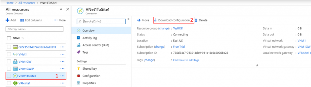 - On the resource list, click on VNet1ToSite1.