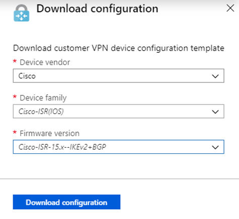 Like AWS, Azure provides customized on-premises device configuration templates to get your side of the connection going. You can download these from PowerShell if you know the syntax for the on-premise platform you’ll use, as follows. This particular PowerShell snippet will work for this lab, but if you have a Juniper device (for example) you’ll need to change out the vendor name, device family, and firmware version: