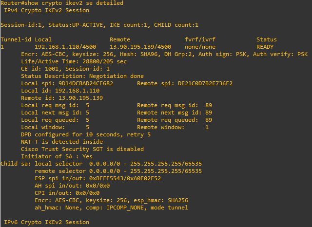 Once you’ve made the required modification to the router snippet above and entered those into your router, the site-to-site VPN should come up. The first thing we can verify is IKEv2 session. At the router terminal prompt, type show crypto ikev2 session detailed. It should show something similar: