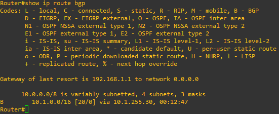If we are BGP peers with the Azure Vnet, we should also see some routes being learned from that peer in the route table, and according to the output above, we are. To verify this, type show ip route bgp at the router’s CLI. In the output below, we are learning the 10.1.0.0/16 route via the 10.1.255.30 neighbor.